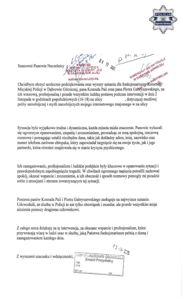 Natychmiastowa reakcja profesjonalne podejście oraz zaangażowanie policjantów pozwoliły na szybkie przekazanie informacji odpowiednim służbom i udzielenie pomocy zanim doszło do tragedii. Dzięki ich czujności i determinacji udało się uratować zdrowie i życie obu osób. Interwencja została przeprowadzona z pełnym poszanowaniem godności osób w kryzysie oraz w duchu policyjnej służby.