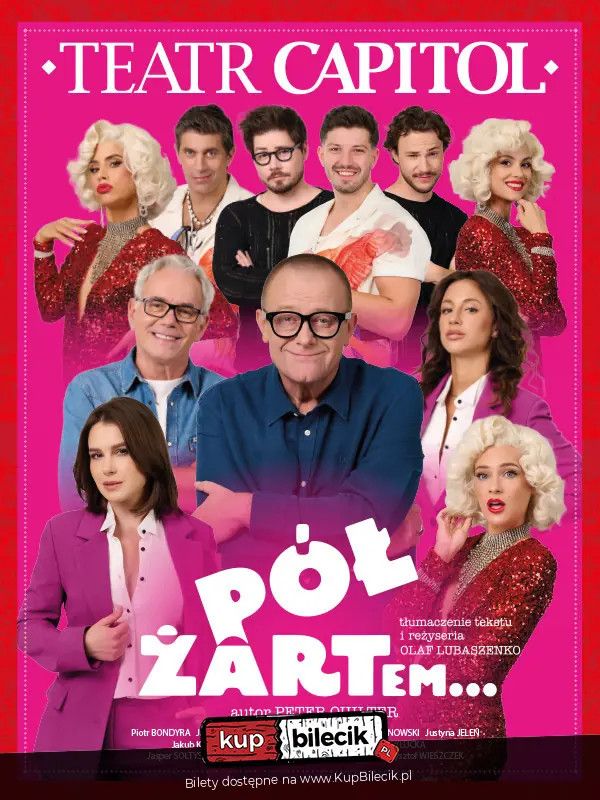 bilety: Wyobraź sobie upalny weekend na wsi: stary, lekko zarośnięty dom, dziki sad pełen jabłek, basen, który pamięta lepsze czasy... i powrót dorosłych dzieci do rodzinnych pieleszy. Brzmi sielsko? Oj, nie tak szybko! Tu każdy ma swoje dziwactwa, a największym z nich jest... miłość. Czy da się pogodzić z przeszłością, nie tracąc kontaktu z rzeczywistością? Czy wyobraźnia to ucieczka, czy może ratunek? I czy na pewno wszyscy widzą to samo? Poznajcie: Harry"ego - ojca, który codziennie "rozmawia" z Marilyn Monroe, Scotta - syna z syndromem wiecznego niezdarnego dziecka, Amy - córkę z temperamentem ostrzejszym niż najlepszy blender oraz Maxa - chłopaka, który filozofuje o życiu... ale boi się pająków bardziej niż własnych myśli! W tej komedii nie zabraknie rodzinnych docinków, kłótni o marchewkę w puszce i pytań, dlaczego czasem lepiej nie zaglądać do szafki pod zlewem. A kiedy do akcji wkracza Marilyn - ikona, duch czy po prostu fantazja? - wszystko staje na głowie, a rzeczywistość miesza się z wyobraźnią! Olaf Lubaszenko zebrał na scenie gwiazdorską obsadę, która udowadnia, że najlepsze terapie zaczynają się od kubka kawy a nawet najtrudniejsze rozmowy rodzinne można przeprowadzić z uśmiechem. Przyjdź, zanurz się w atmosferze ciepłego lata i sprawdź, czy w Twojej rodzinie też łatwiej rozmawia się...pół żartem! Autor: Peter Quilter Tłumaczenie i reżyseria tekstu: Olaf Lubaszenko Kostiumy: Tomasz Jacyków Scenografia: Joanna Pielat Muzyka: Jerzy Mączyński Projekt plakatu: Honorata Paprot Reżyser castingu: Agnieszka Koniecka Kierownik produkcji: Katarzyna Ośko Bilety do nabycia na: KupBilecik.plPół żartem artyści: Różni artyściWyobraź sobie upalny weekend na wsi: stary, lekko zarośnięty dom, dziki sad pełen jabłek, basen, który pamięta lepsze czasy… i powrót dorosłych dzieci do rodzinnych pieleszy. Brzmi sielsko Oj, nie tak szybko! Tu każdy ma swoje dziwactwa, a największym z nich jest… miłość. Czy da się pogodzić z przeszłością, nie tracąc kontaktu z rzeczywistością Czy wyobraźnia to ucieczka, czy może ratunek I czy na pewno wszyscy widzą to samo. Bilety do nabycia na: KupBilecik.pl |