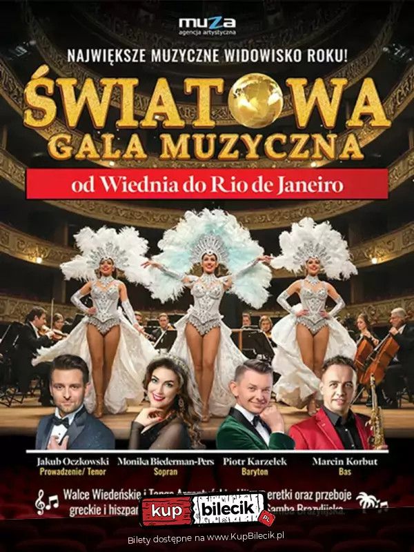 bilety: Światowa Gala Muzyczna - Od Wiednia do Rio de Janeiro. Największe muzyczne widowisko roku! Agencja Artystyczna Muza zaprasza na ogólnopolską trasę koncertową, która już wkrótce zawita do największych miast Polski! Przed Państwem niezwykła muzyczna podróż przez kontynenty, style i nastroje - koncert pełen emocji, barw i ponadczasowych melodii od arystokratycznego Wiednia, przez słoneczne Hawaje, Grecję, Hiszpanię, Włochy aż po roztańczone Rio! "Światowa Gala Muzyczna - od Wiednia do Rio de Janeiro" to prawdziwe święto muzyki - pełne pasji, nostalgii, zachwytu i radości życia. W programie zabrzmią majestatyczne walce wiedeńskie, gorące tanga argentyńskie, największe hity operetkowe, a także rozkołysane przeboje greckie, hiszpańskie i włoskie. Wśród nich usłyszą Państwo m.in.: Ten wieczór nie będzie zwykłym koncertem. To będzie opowieść - o uczuciach, rytmach, tradycji i pięknie. Muzyczne krajobrazy, taneczne emocje, światowa jakość i wyjątkowa energia - to wszystko czeka na Państwa podczas Światowe Gali Muzycznej! "Światowa Gala Muzyczna - od Wiednia do Rio de Janeiro" - daj się porwać dźwiękom, które zostaną z Tobą na zawsze. Scenariusz i reżyseria: Monika Biederman-Pers Bilety do nabycia na: KupBilecik.plŚwiatowa Gala Muzyczna artyści: Monika Biederman-Pers, Piotr Karzełek, Jakub Oczkowski, Marcin Korbut, Bling Dance Show i inniAgencja Artystyczna Muza zaprasza na ogólnopolską trasę koncertową, która już wkrótce zawita do największych miast Polski! Widowisko "Światowa Gala Muzyczna - Od Wiednia do Rio de Janeiro" to artystyczna uczta stworzona przez duet Duo Performance - Monikę Biederman-Pers i Piotra Karzełka, którzy wystąpią również jako główni soliści wieczoru. To niezapomniana podróż przez muzyczne i taneczne klimaty całego świata - od arystokratycznego Wiednia, przez słoneczne Hawaje, Grecję, Hiszpanię, Włochy aż po roztańczone Rio! Bilety do nabycia na: KupBilecik.pl |